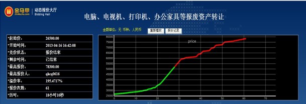 2013年4月17日10时39分18秒,随着金马甲网络竞价大厅里限时竞价倒计时归零,我市场对青海省师范大学电脑、电视机、打印机、办公家具等报废资产转让竞价完美谢幕。该批资产转让价以26500元整起拍,经过61次激烈的竞价、报价,最终以78300元成交,该项目总增值51800元,增值率高达195.5%。本次竞价大幅增值的成功,再一次向社会展现了青海省产权交易市场的“不凡魅力”和产权交易平台给大家带来的所有资产处置最大化的无穷潜质。