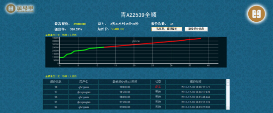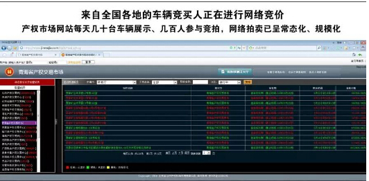 3、2010年12月27日至29日“青海省行政事业单位国有资产公物仓公务车网络竞价”活动取得圆满成功!60台闲置公务车成交总价高达174.99万元。此次网络竞价活动,我市场网站的日有效点击量高达5000余次,咨询电话共计1850个,全省共有545人(各州县共计115名)报名竞拍,经审核228名符合竞买条件参与网络竞拍活动。