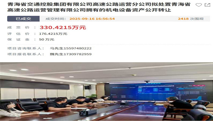 近日青海省交通控股集团有限公司下属高速公路运营管理有限公司拥有的一批机电设备资产通过我市场成功转让。该项目最终历经21天宣传推广,最终以高达87.29%的增值率圆满落槌。此次交易不仅彰显了青海省产权交易市场在促进资产资源高效流转、优化资源配置方面的专业能力,也进一步提升了我市场在省内外区域市场的活跃度。经过107轮激烈竞价,最终,项目以330.4215万元落槌,较挂牌价增值154万元,87.29%的增值率,凸显了我市场发现价值、发现投资人的强大市场功能,高效细致的国有资产保值增值工作得到转让方的高度赞誉。