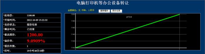 此次活动共有2位竞买人参加网络竞价,起拍价为1100.00元整,经过1次报价,最终以1200.00元整成交,项目增值率达9.0%。