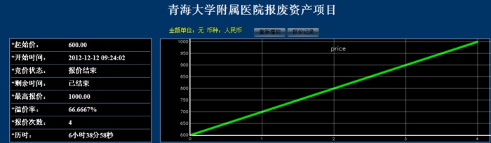 此次活动共有5位竞买人参加网络竞价,起拍价为600.00元整,经过4次报价,最终以1000.00元整成交,项目增值率达67.0%。