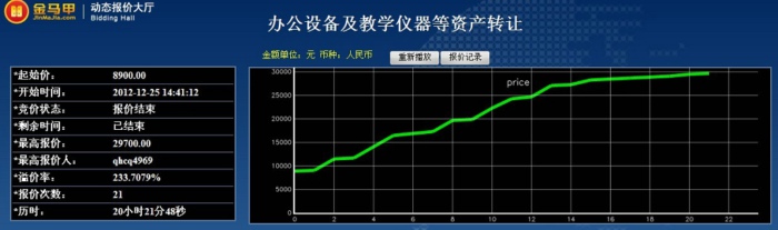 此次活动共有15位竞买人参加网络竞价,起拍价为8900.00元整,经过21次报价,最终以29700.00元整成交,项目增值率达234%。