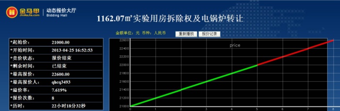 此次活动共有4位竞买人参加网络竞价,起拍价为21000.00元整,经过8次报价,最终以22600.00元整成交,项目增值率达7.62%。