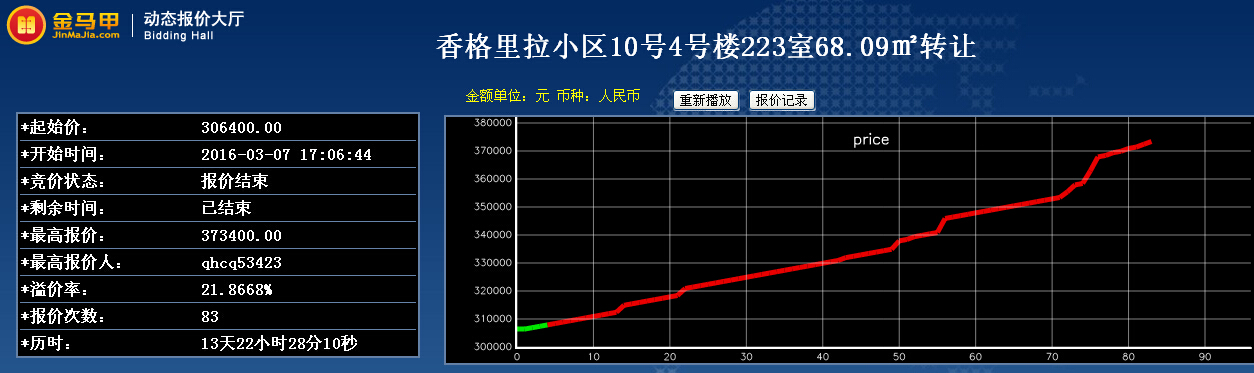 此次活动共有11位竞买人参加网络竞价,起拍价为30.64万元整,经过83次报价,最终以37.34万元整成交。