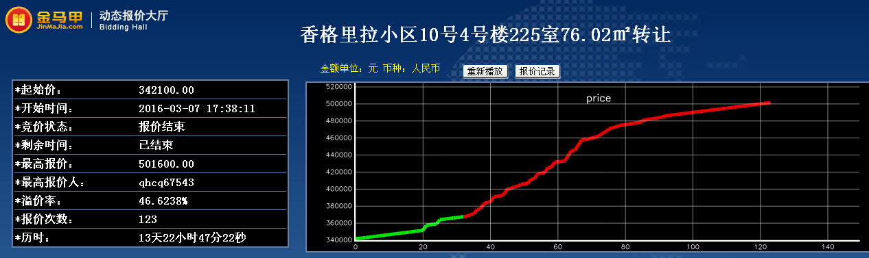 此次活动共有15位竞买人参加网络竞价,起拍价为34.21万元整,经过123次报价,最终以50.16万元整成交。
