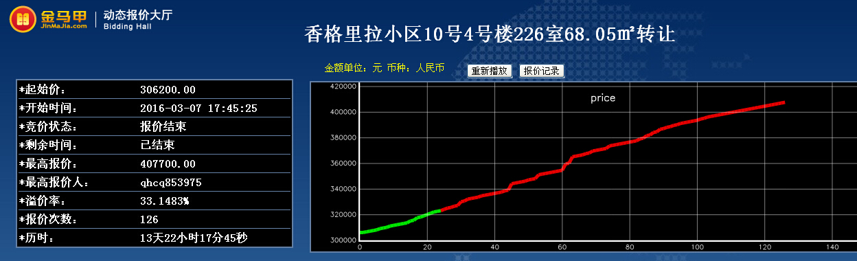 此次活动共有14位竞买人参加网络竞价,起拍价为30.62万元整,经过126次报价,最终以40.77万元整成交。