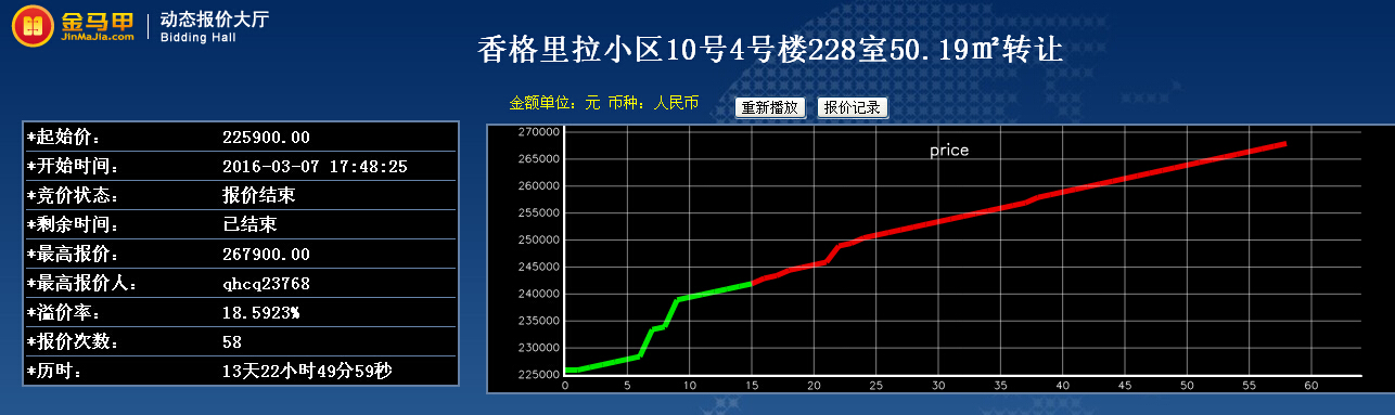 此次活动共有5位竞买人参加网络竞价,起拍价为22.59万元整,经过58次报价,最终以26.79万元整成交。