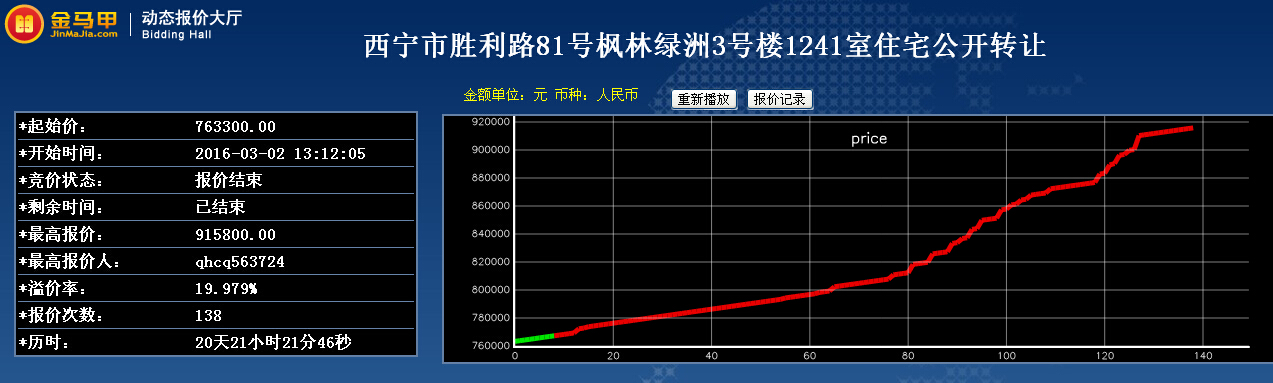 此次活动共有8位竞买人参加网络竞价,起拍价为76.33万元整,经过138次报价,最终以91.58万元整成交。