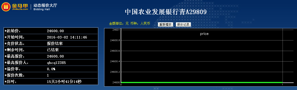 此次活动共有1位竞买人参加网络竞价,起拍价为2.46万元整,经过1次报价,最终以2.46万元整成交。