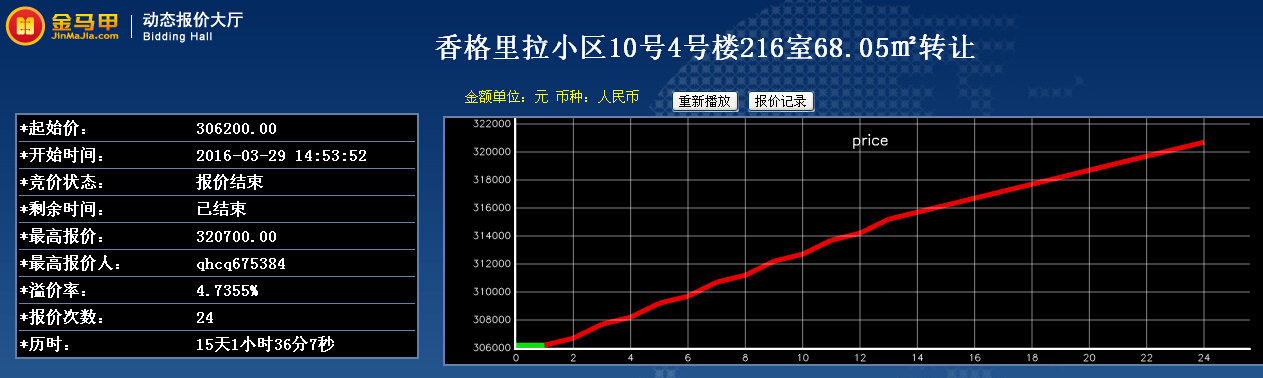 此次活动共有4位竞买人参加网络竞价,起拍价为30.62万元整,经过24次报价,最终以32.07万元整成交。