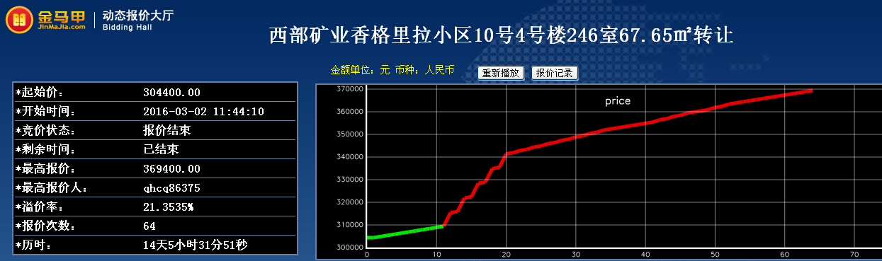 此次活动共有9位竞买人参加网络竞价,起拍价为30.44万元整,经过64次报价,最终以36.94万元整成交。