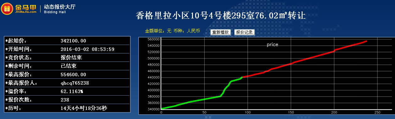 此次活动共有16位竞买人参加网络竞价,起拍价为34.21万元整,经过238次报价,最终以55.46万元整成交。