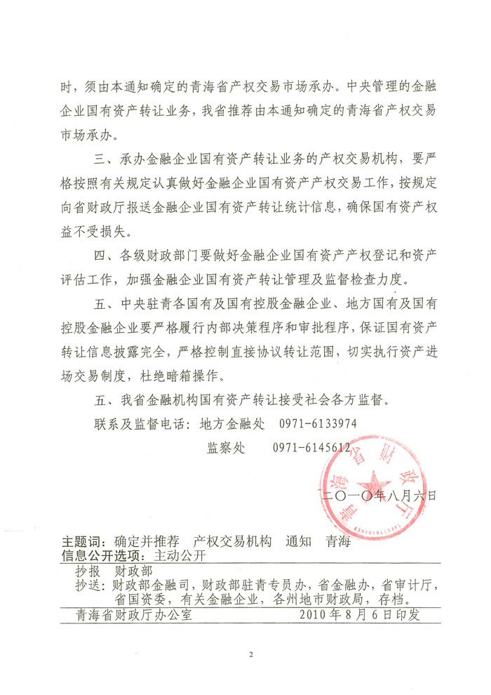 关于确定青海省产权交易市场承办我省金融企业国有资产交易业务并推荐该机构承担中央管理金融企业国有资产转让业务的通知