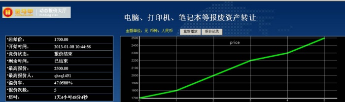此次活动共有7位竞买人参加网络竞价,起拍价为1700.00元整,经过5次报价,最终以2500.00元整成交,项目增值率达47%。